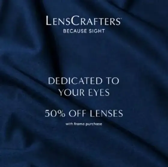 Receive 50% off lenses with a purchase of a frame. Complete pair (frame + lenses) purchase required; savings applied to lenses. Valid on multiple pairs. Cannot be combined with vision benefits, other offers, previous purchases, readers, or non prescription sunglasses. Valid prescription is required. Cartier®, Lindberg®, and Maui Jim® frames excluded. Additional exclusions may apply, see associate for details. Discounts off tag price. No cash value. Offer valid in-store and online at LensCrafters.com. Void where prohibited. Offer valid through 4/5/2026.